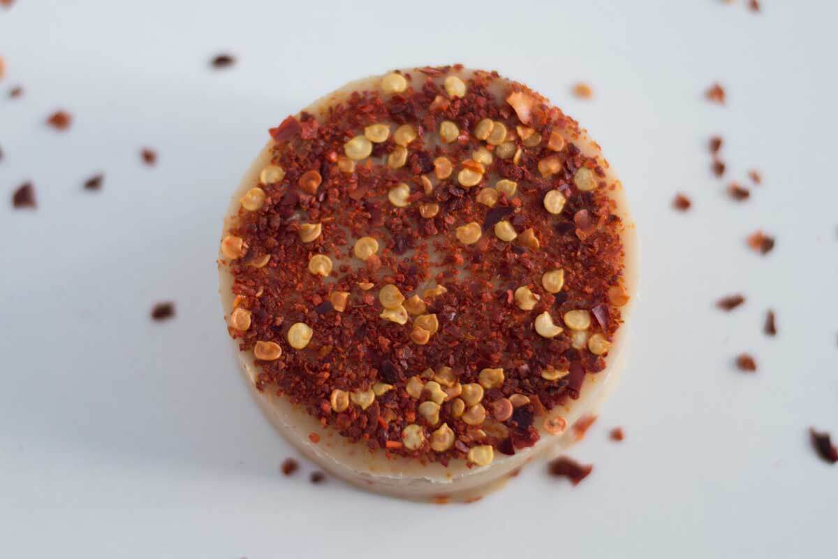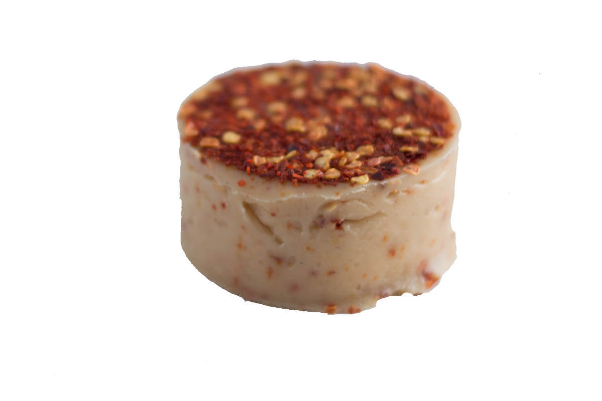 Brânză vegană din nuci de caju crude, maturată timp de 3 săptămani cu fulgi de chili. Aroma puternică și textura rigidă o face perfectă pentru salate sau sendvișuri.