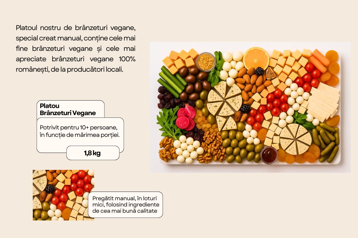 Platoul nostru de brânzeturi vegane, special creat manual, conține cele mai fine brânzeturi vegane și cele mai apreciate brânzeturi vegane 100% românești, de la producători locali. 7 tipuri de brânzeturi vegane (realizate din nuci caju, cocoș sau migdale), antipasti, nuci, fructe proaspete și uscate, legume, chutney, sirop de agave, precum și garnituri de sezon. Potrivit pentru 5-10+ persoane, în funcție de mărimea porției. Ideal pentru mese de sărbători, evenimente corporate sau platouri elegante pentru invitați care apreciază alternativele curate și creative.