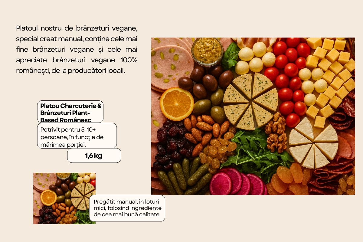 Platoul nostru de “mezeluri” si brânzeturi plant-based, special creat manual, conține cele mai apreciate alternative plant-based, 100% românești, de la producători locali. Acest platou conține peste 1 kg de “mezeluri” plant-based românești (pe bază de soia, mazăre, legume) și cele mai apreciate brânzeturi vegane 100% românești, antipasti, nuci, fructe proaspete și uscate, muștar integral, jeleu de ceapă, chutney, sirop de agave bio și garnituri de sezon. Potrivit pentru 5-10+ persoane, în funcție de mărimea porției. Ideal pentru mese de sărbători, evenimente corporate sau platouri elegante pentru invitați care apreciază alternativele curate și creative.